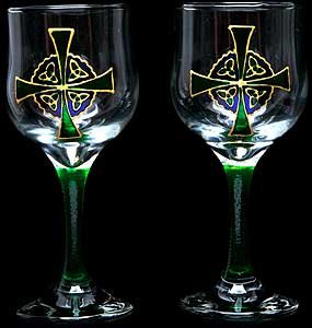 Celtic Glass Designs Set of 2 Hand Painted Wine Glasses in a Celtic Cross Design.