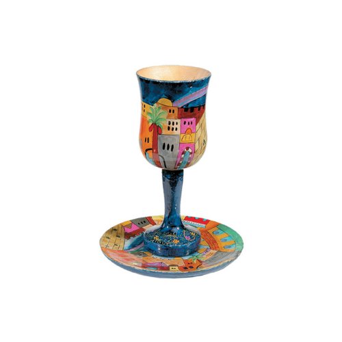 - This large wooden Kiddush cup and saucer set features intricate hand-painted scenes from the holy city.