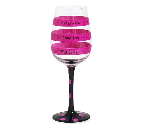 Hand-painted and decal glass wine glass with hot pink fill lines. Bottom line says “Easy Day”, middle “Rough Day”, and top “Don’t Even Ask”. Stem is black with hot pink polka dots. [Read more...]