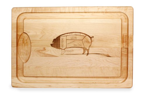 - Maple wood, laser-engraved pig design, channel intended to harness run away juices, includes handles