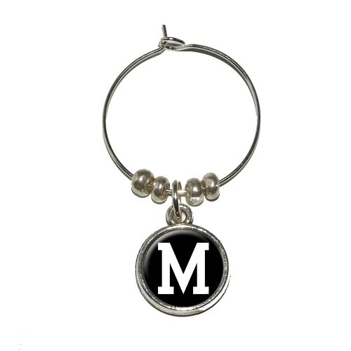 Letter M Initial Black White Wine Glass Charm Drink Stem Marker Ring